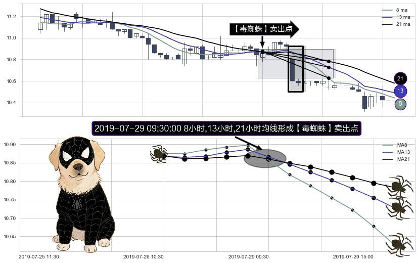 形态多维评估: ⚀ 2019-07-29 09:30:00小时显现 8小时-13小时-21小时均线 【毒蜘蛛】卖出点 看空信号,后市看跌,卖出