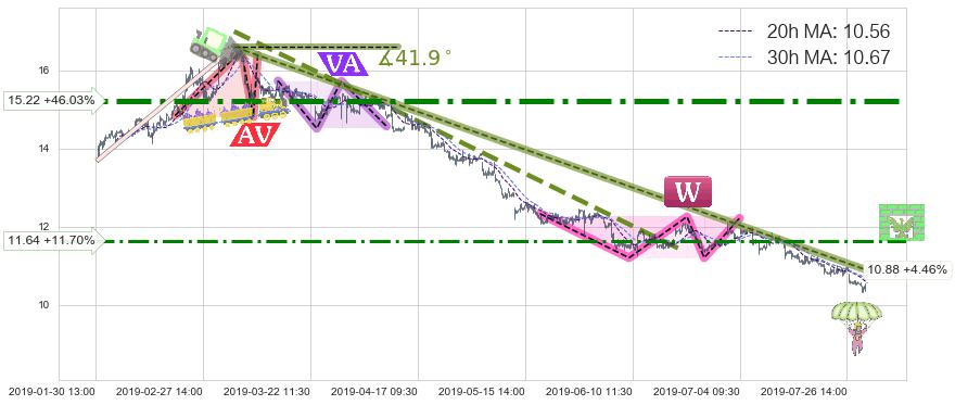 从2019-03-06 13:00至2019-06-20 09:30,共包含418个小时,阶段股价下跌-31.42%,阶段股价变动位移路程比: 1 : 5,下跌趋势角度: 51.1