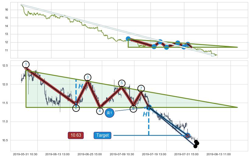 ➣ 【已确认突破】下降三角形整理 起点:05-28:10,突破点:07-15:09,形态共192交易小时
