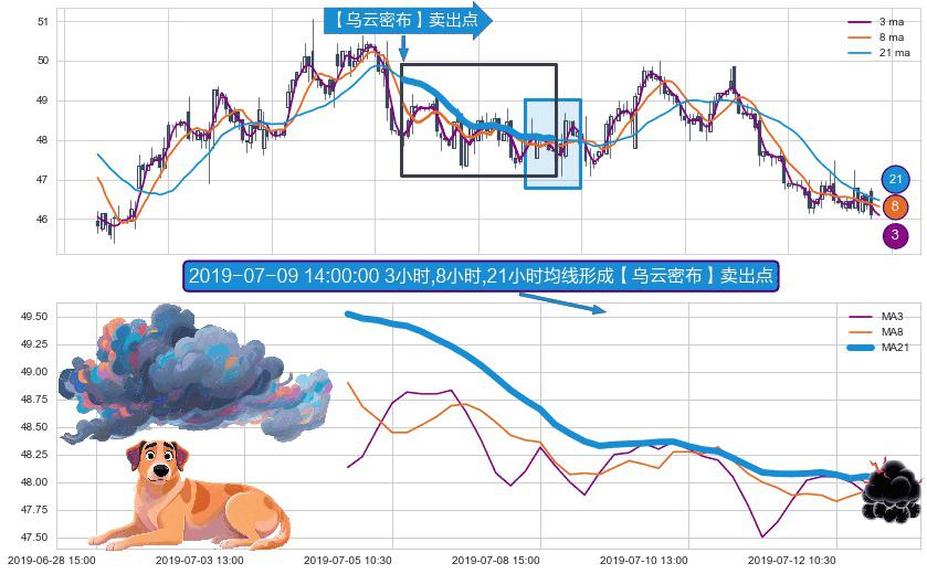 ⚀ 2019-07-04 14:00:00小时-2019-07-12 14:00:00小时显现 3小时-8小时-21小时均线 【乌云密布】卖出点 看空信号,后市看跌,卖出