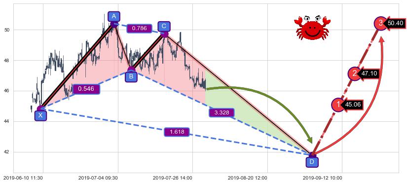 ➢ 距离预测D点位置有足够的下跌空间, 与看涨【螃蟹】形态相反,实际方向【看跌】