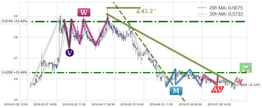 🦴 长线均值回复组合短线趋势跟踪[强阻力信号]2019-04-10 13:00-2019-07-31 15:00下跌趋势依然成立(下跌趋势跟踪依然存在),短线价格略微上行反弹(均值回复猜想),即将接近下跌趋势提供的未破位阻力价格:0.5693。