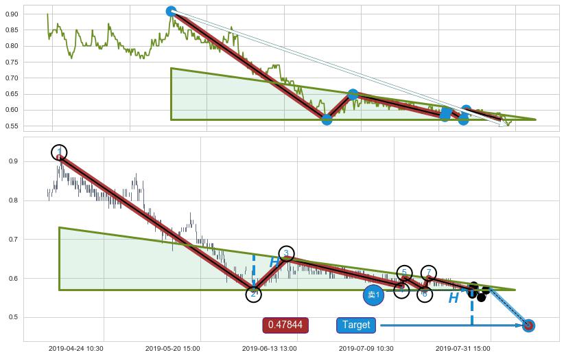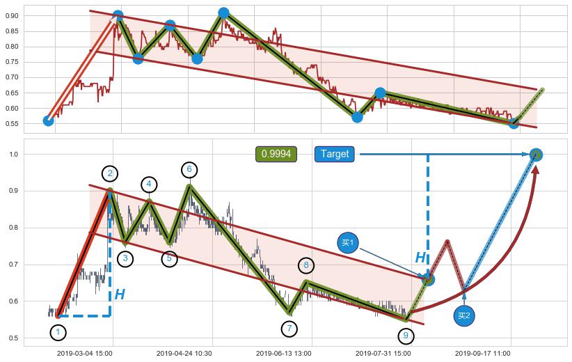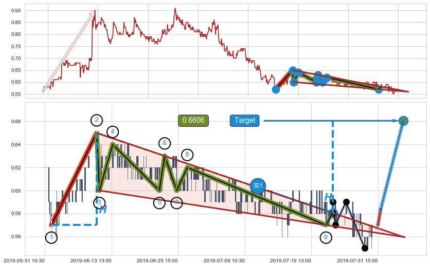 ➢ 最小中继整理涨幅→𝐇: 0.0800000 (𝐇楔型旗杆的长度:楔型起点→顶点)