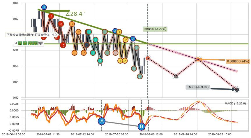 ➣ 预测:2019-08-19 10:00,【试探阻力】稳定目前下跌趋势的前提下,预测价格:0.5686