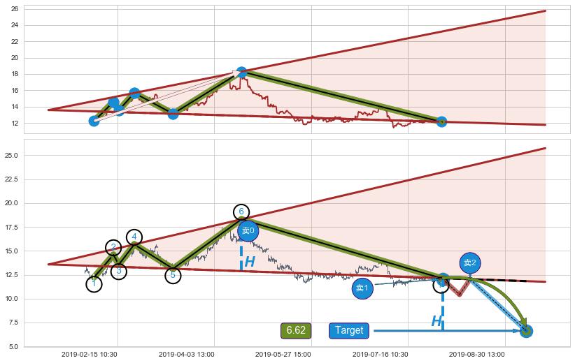 ➢ 最小反转跌幅→𝐇: 5.42 (逐步抬高阻力斜边最后的阻力点⑥与支撑边垂直距离)