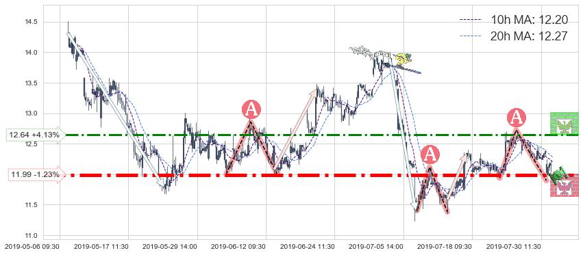 ♘ 阻力价格位12.64,可信任强度59.77%,距离最后交易2019-07-31 15:00形成的收盘价格12.14相差 +4.13%