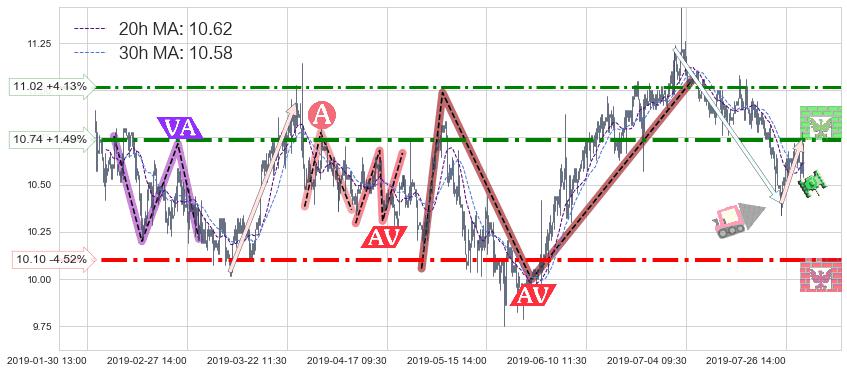 ♘ 支撑价格位10.10,可信任强度84.21%,距离最后交易2019-07-31 15:00形成的收盘价格10.58相差 -4.52%