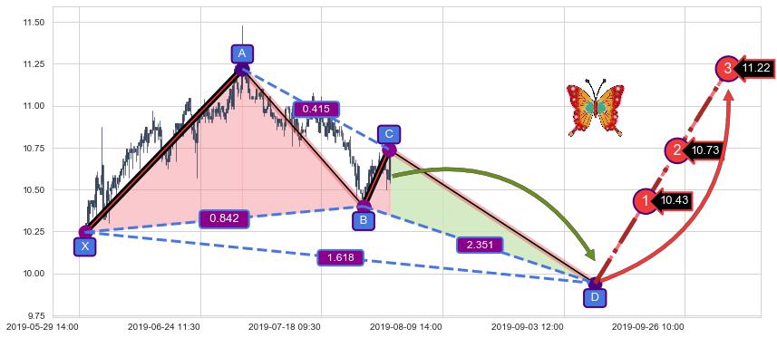 ➣ 未完成【蝴蝶】形态起点X: 05-30:13, 已到达C点: 07-31:11, 预测最终D点: 09-09:14, 共420交易小时