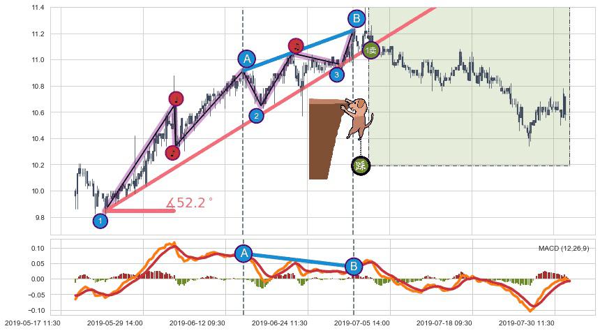 从2019-05-23 15:00至2019-07-04 09:30,共包含164个小时,阶段股价上涨12.03%,阶段股价变动位移路程比: 1 : 4,上涨趋势角度: 52.2