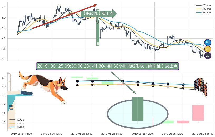 形态多维评估: ⚀ 2019-06-25 09:30:00小时显现 20小时-30小时-60小时均线 【绝命跳】卖出点 看空信号,后市看跌,卖出