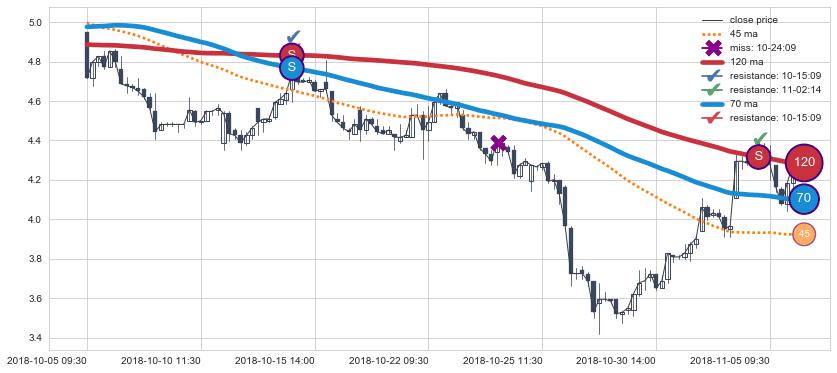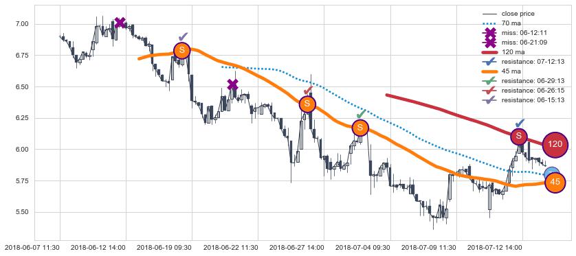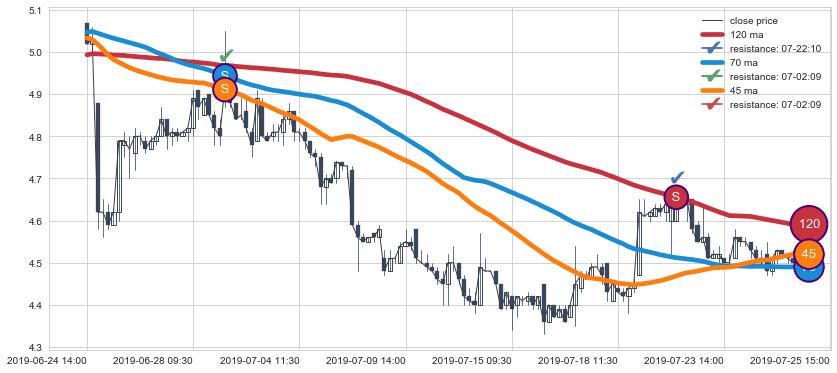 下跌趋势06-24 14:00-07-25 15:00,均线120, 45, 70确认关键阻力2处