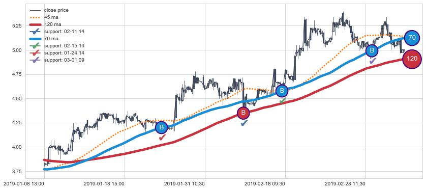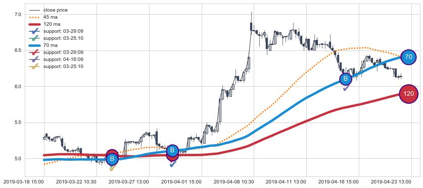 上涨趋势03-18 15:00-04-23 13:00,均线120, 70确认关键支撑3处