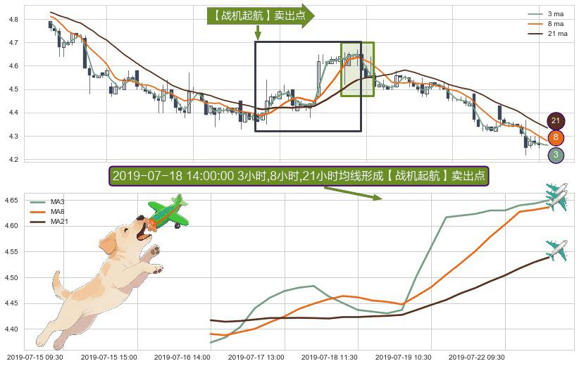 形态多维评估: ⚀ 2019-07-16 14:00:00小时-2019-07-22 13:00:00小时显现 3小时-8小时-21小时均线 【战机起航】卖出点 看空信号,后市看跌,卖出