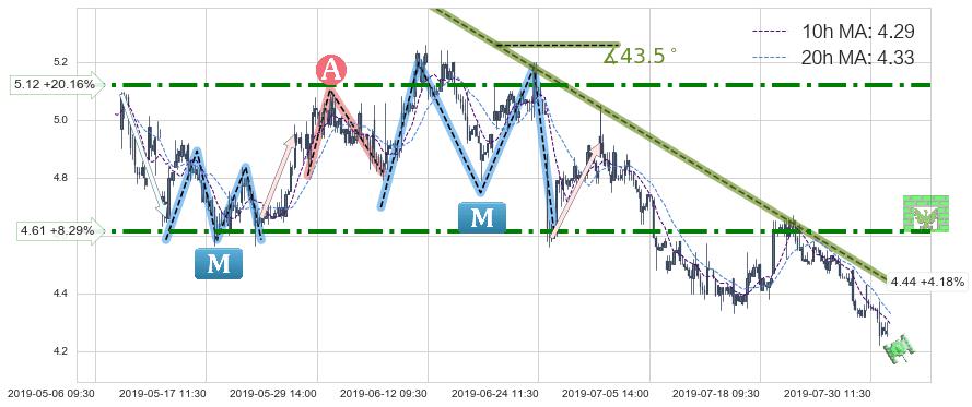 ♘ 阻力价格位4.61,可信任强度84.57%,距离最后交易2019-07-31 15:00形成的收盘价格4.26相差 +8.29%