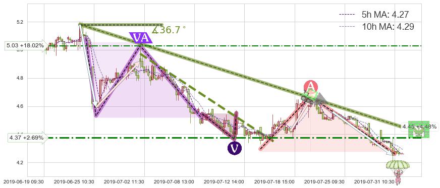 ♘ 在最后的下跌阶段2019-06-24 09:30至2019-07-31 14:00,存在 持续未破位的阻力位 ,阻力价格4.45,可信任强度86.23%,其距离最后价格4.26相差 +4.48%