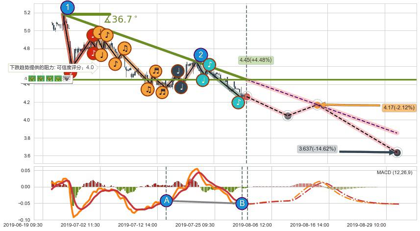 ➣ 预测:2019-08-15 11:00,【试探阻力】稳定目前下跌趋势的前提下,预测价格:4.17