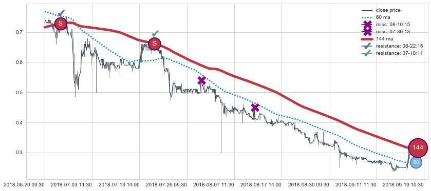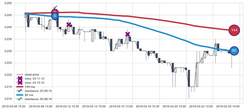⚅ 买点向上突破均线后,价格走势很纠结,不断在均线周围试探,有再次下探破位均线的可能