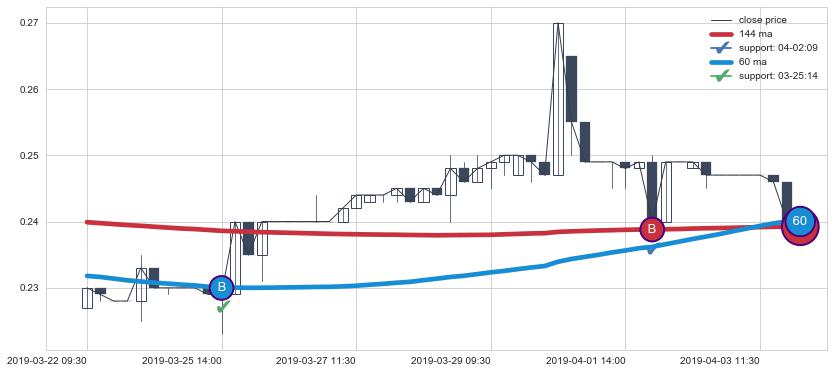 ⚅ 买点向上突破均线后,价格走势有持续向上的迹象,但动能稍显不足,迟迟不能远离均线
