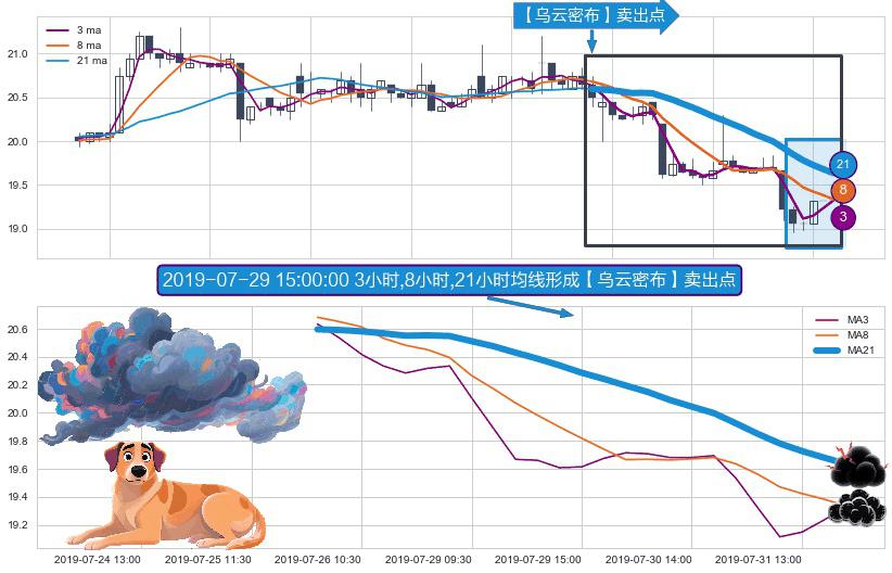 形态多维评估: ⚀ 2019-07-25 15:00:00小时-2019-07-31 15:00:00小时显现 3小时-8小时-21小时均线 【乌云密布】卖出点 看空信号,后市看跌,卖出