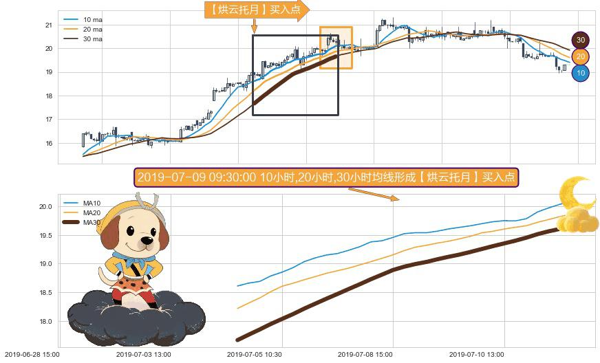 形态多维评估: ⚀ 2019-07-04 13:00:00小时-2019-07-11 13:00:00小时显现 10小时-20小时-30小时均线 【烘云托月】买入点 看多信号,后市看涨,买入