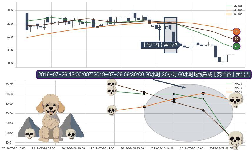 形态多维评估: ⚀ 2019-07-26 14:00:00-小时至2019-07-29 09:30:00-小时显现 20小时-30小时-60小时均线 【死亡谷】卖出点 看空信号,后市看跌,卖出