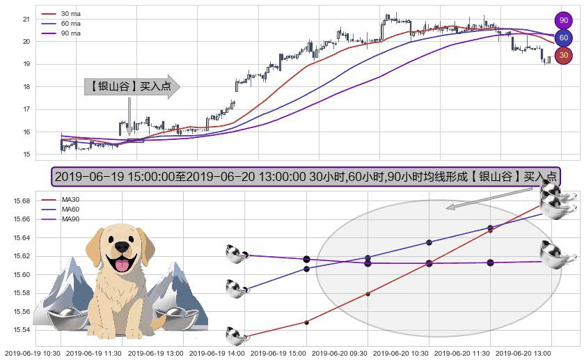 形态多维评估: ⚀ 2019-06-20 09:30:00-小时至2019-06-20 13:00:00-小时显现 30小时-60小时-90小时均线 【银山谷】买入点 看多信号,后市看涨,买入