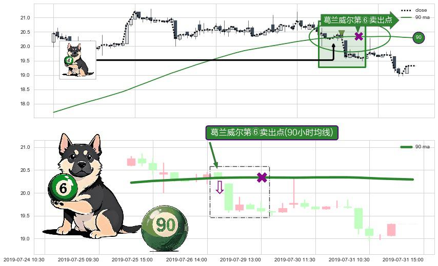 形态多维评估: ⚀ 2019-07-26 15:00:00-小时显现 葛兰威尔均线 90小时均线 第⑥卖出点 走势反转见顶信号,后市看跌,卖出信号