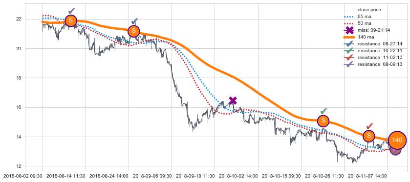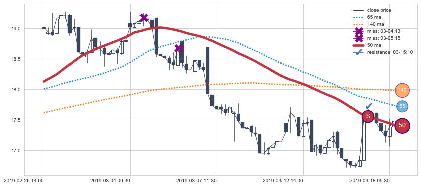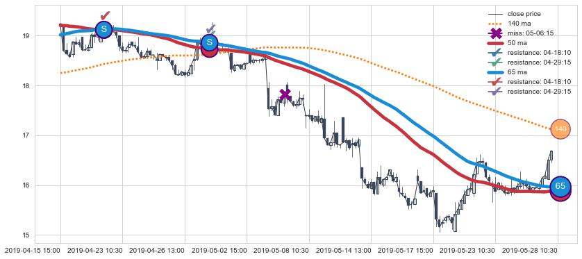 下跌趋势04-15 15:00-05-28 10:30,均线65, 50确认关键阻力2处