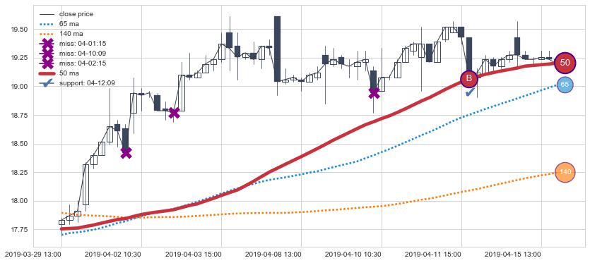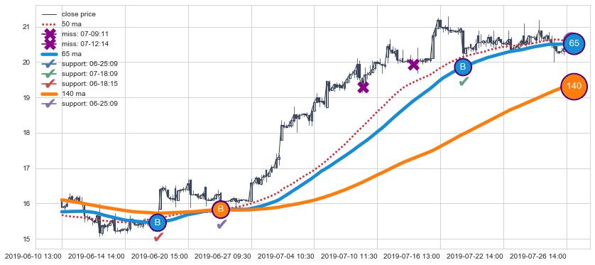 上涨趋势06-10 13:00-07-26 14:00,均线65, 140确认关键支撑3处