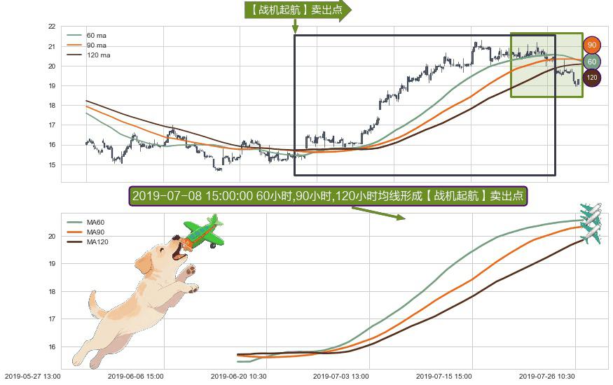 形态多维评估: ⚀ 2019-06-17 15:00:00小时-2019-07-26 15:00:00小时显现 60小时-90小时-120小时均线 【战机起航】卖出点 看空信号,后市看跌,卖出