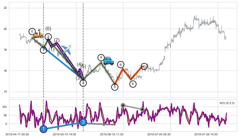 ➣ 第一, 三驱动浪端点:【KDJ】走势出现【常规背离 & 反转信号】背离程度57.86%,背离夹角角度102.1˚,背离程度中等