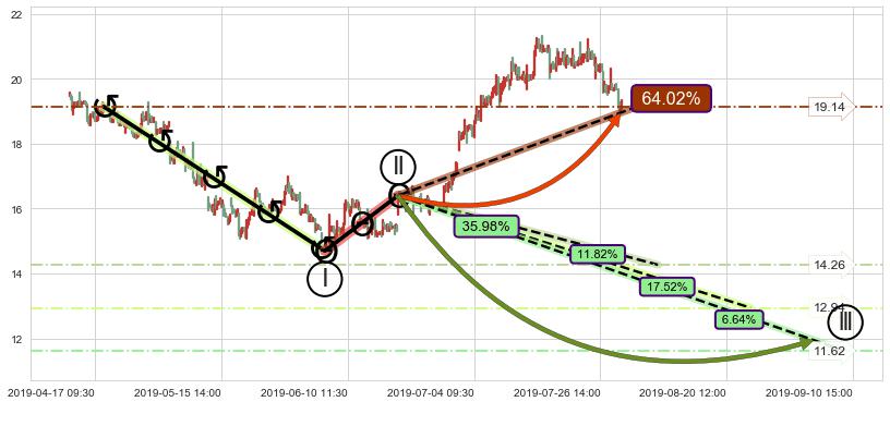 从2019-04-11 13:00至2019-05-20 14:00,共包含140个小时,阶段股价下跌-23.18%,阶段股价变动位移路程比: 1 : 4,下跌趋势角度: 72.5