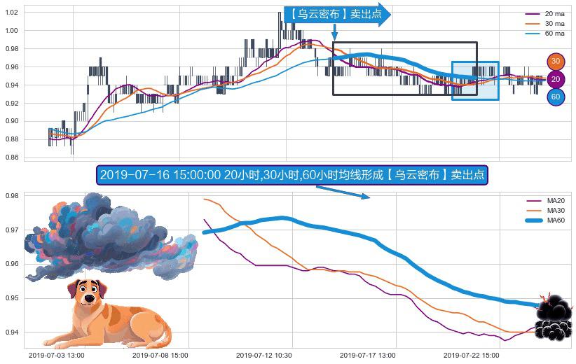 形态多维评估: ⚀ 2019-07-09 11:30:00小时-2019-07-24 11:30:00小时显现 20小时-30小时-60小时均线 【乌云密布】卖出点 看空信号,后市看跌,卖出