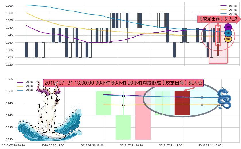 形态多维评估: ⚀ 2019-07-31 13:00:00小时显现 30小时-60小时-90小时均线 【蛟龙出海】买入点 看多信号,后市看涨,买入