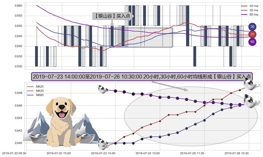 形态多维评估: ⚀ 2019-07-23 15:00:00-小时至2019-07-26 10:30:00-小时显现 20小时-30小时-60小时均线 【银山谷】买入点 看多信号,后市看涨,买入