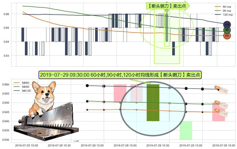 形态多维评估: ⚀ 2019-07-29 09:30:00小时显现 60小时-90小时-120小时均线 【断头铡刀】卖出点 看空信号,后市看跌,卖出