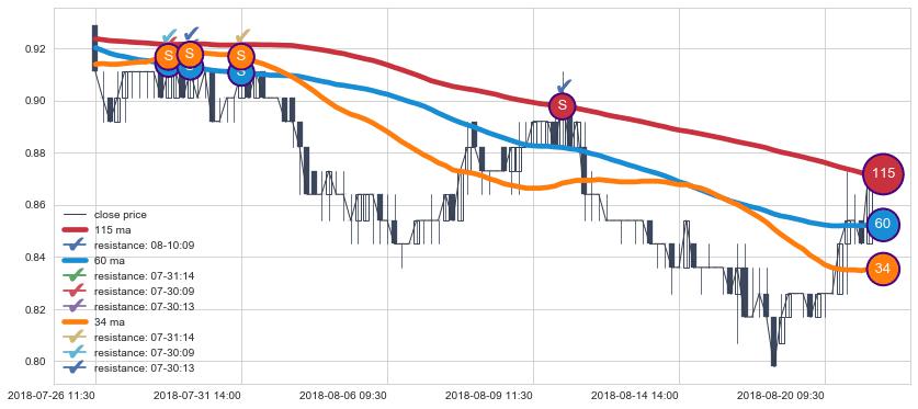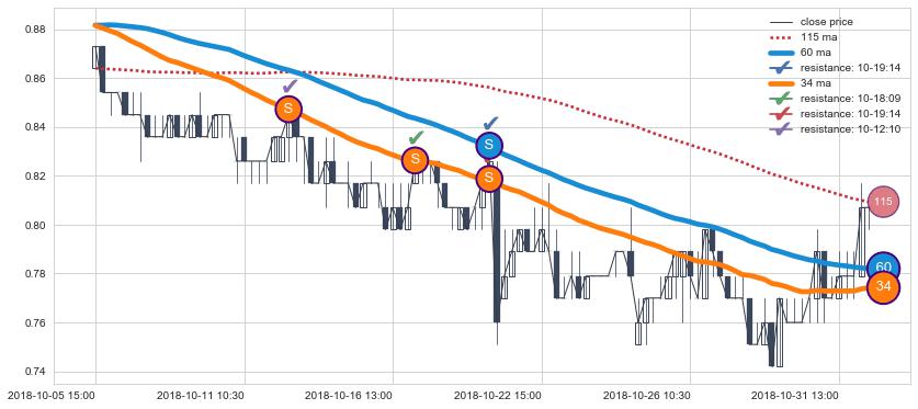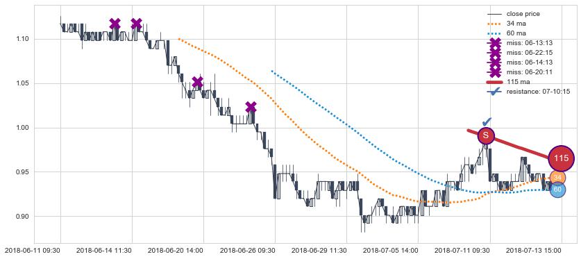 下跌趋势07-26 11:30-08-21 09:30,均线34, 115, 60确认关键阻力4处