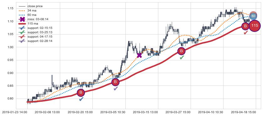 上涨趋势01-23 14:00-04-18 15:00,均线115确认关键支撑4处