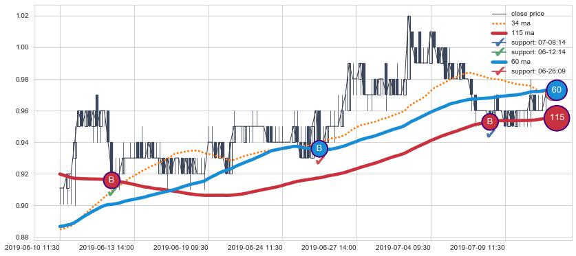 上涨趋势06-10 11:30-07-11 10:30,均线115, 60确认关键支撑3处