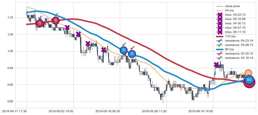 下跌趋势04-17 11:30-06-18 11:30,均线115, 60确认关键阻力4处