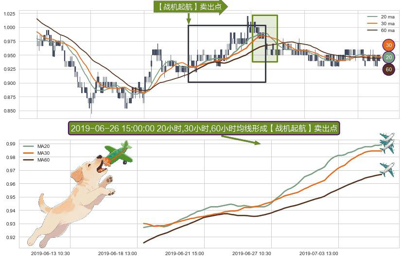 形态多维评估: ⚀ 2019-06-18 15:00:00小时-2019-07-05 14:00:00小时显现 20小时-30小时-60小时均线 【战机起航】卖出点 看空信号,后市看跌,卖出