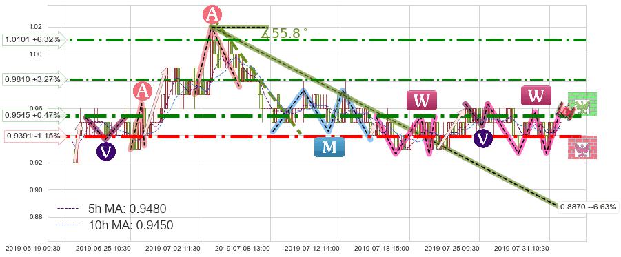 ♘ 阻力价格位0.9545,可信任强度90.24%,距离最后交易2019-07-31 15:00形成的收盘价格0.9500相差 +0.47%