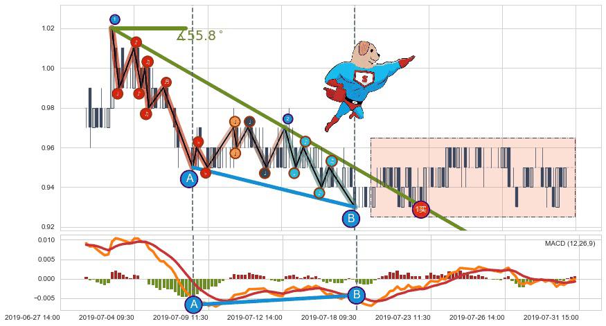 从2019-07-03 09:30至2019-07-19 15:00,共包含78个小时,阶段股价下跌-6.83%,阶段股价变动位移路程比: 1 : 6,下跌趋势角度: 55.8