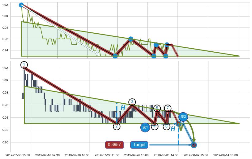 ➣ 最小中继整理跌幅→𝐇: 0.0343333 (下侧直角边第一支撑点②与斜边垂直距离)