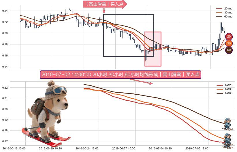 ⚀ 2019-06-21 10:30:00小时-2019-07-11 09:30:00小时显现 20小时-30小时-60小时均线 【高山滑雪】买入点 看多信号,后市看涨,买入