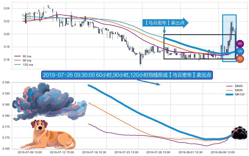 ⚀ 2019-07-16 11:30:00小时-2019-08-06 14:00:00小时显现 60小时-90小时-120小时均线 【乌云密布】卖出点 看空信号,后市看跌,卖出