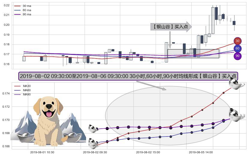 ⚀ 2019-08-02 10:30:00-小时至2019-08-06 09:30:00-小时显现 30小时-60小时-90小时均线 【银山谷】买入点 看多信号,后市看涨,买入