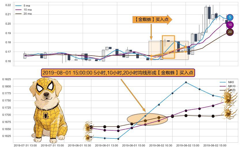 ⚀ 2019-08-01 15:00:00小时显现 5小时-10小时-20小时均线 【金蜘蛛】买入点 看多信号,后市看涨,买入