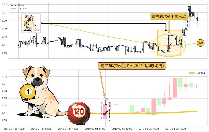 ⚀ 2019-08-01 14:00:00-小时显现 葛兰威尔均线 120小时均线 第买①入点 走势反转见底信号,后市看涨,买进信号