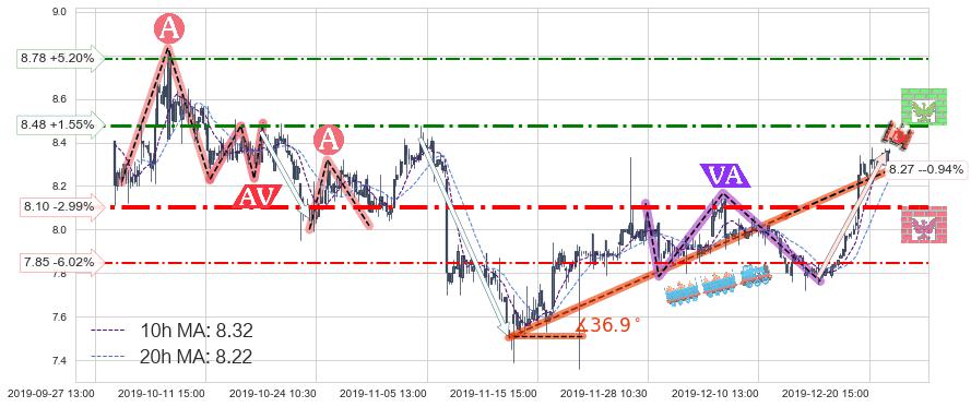 ♘ 阻力价格位8.48,可信任强度68.46%,距离最后交易2019-12-24 11:30形成的收盘价格8.35相差 +1.55%